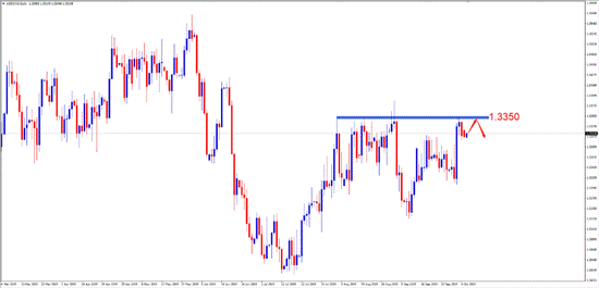 交易策略:激进投资者可尝试于1.3350附近做空,止损1.3400附近,止盈1.3250附近。