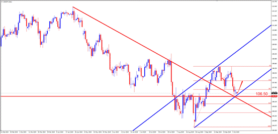 技术点评:D1周期中,美日当前价格测试106.50水平支撑位于上升通道双重支撑位,本周可主考虑做多。