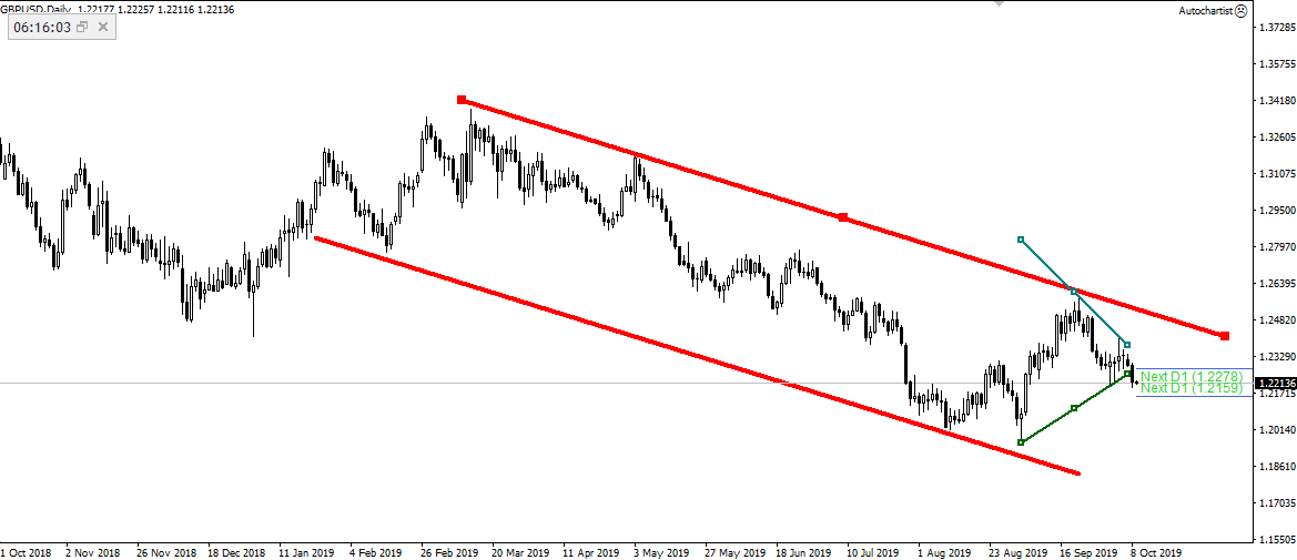 GBP/USD处于日图下降通道,同时跌破Autochartist工具绘制的对称三角形,下一位置可能在1.20附近。