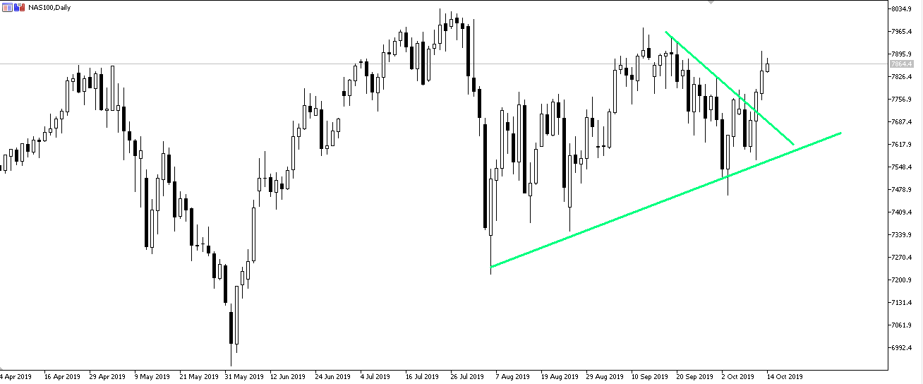 贸易磋商获得了实质性的突破,双方已经约定下次将在APEC峰会前再度进行磋商以形成第一阶段文本。受到利好消息影响纳斯达克100指数NAS100突破了前期的对称三角形,朝着8036的历史高位再度发起冲击。