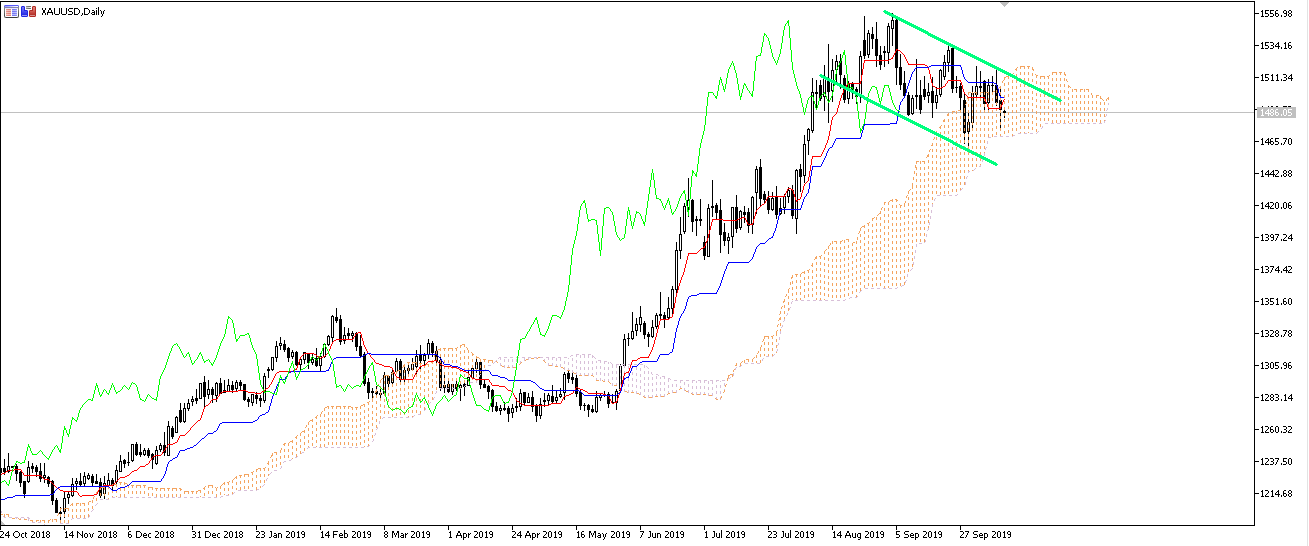 XAU/USD的日图价格已经插入云图中的云层,,同时位于下跌通道中,下方第一步支撑位于1463处。
