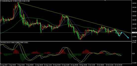 从白银4小时图来看,白银走的比较慢,但一直是压力线之下运行,本级别空头一直未结束,只要没有上破信号,就可以空下去。