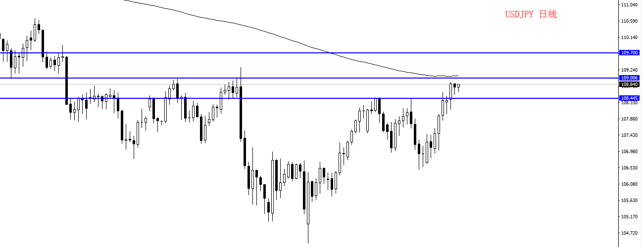 美元兑日元近期升至2个月高位,目前受阻于日线200周期均线附近,昨日日元收出小阴K,可能会形成急停加速的形态。今日重点关注是否破位目前阻力位值,上方短期目标位置看向109.700一带。