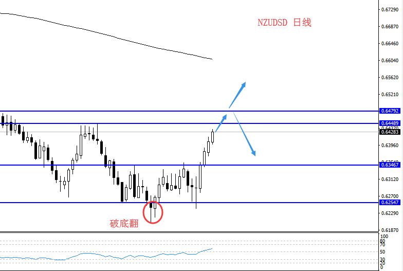 从行情上看,纽元在形成破底翻结构后,突破颈线位置开启了日线级别的多头趋势,目前日线RSI上穿于50中轴,短期继续看多,关注上方0.6449-0.6480一带是否会受阻。