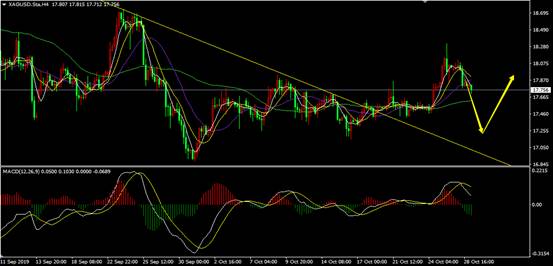 从白银4小时图来看,白银现在则是要大回踩一次前方被突破的趋势线,小级别上也将走了个下跌趋势,好的是四小时级别的支撑还在,比黄金略强。