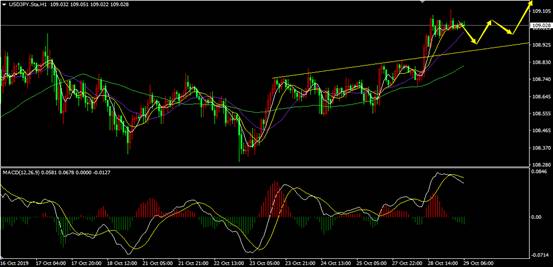 从美元兑日元1小时走势来看,美元兑日元昨天的上破一下子让行情改变,不再是压力附近震荡,再调整大概率要出三买,也是逢低接多。
