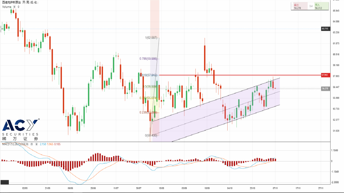 技术面来看,此次原油中线上涨走势仍处于通道线内部,连续三个交易日刷新高点的走势并未突破通道线上轨的压制,行情上行趋势并未加速,中线级别可能围绕之前的通道线进行波动。短线交投中行情在刷新57.78高点后MACD指标背离为空头提供了足够的动能,在价格回落至56.00关口后此动能基本消耗完毕,且价格在此点位受到通道线中轨的支撑,日内可尝试关注4小时图表中行情对该支撑位的试探,油价大几率于支撑位附近短时间持续震荡。