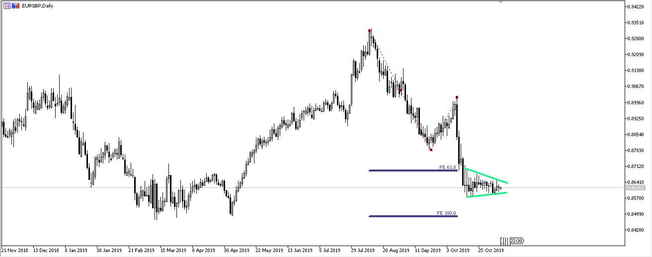 经过前期大幅下跌后,EUR/GBP在上周形成了小实体蜡烛的震荡整理是同样,构成对称三角形。若对称三角形发生突破,可能运行至0.8487,也是前期黄金分割扩展线1.0位置。