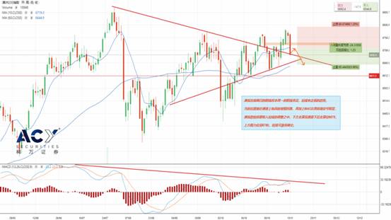 技术面来看,澳指维持震荡上移的行情不变,日线级别依旧运行于三角形形态上轨上方,但连续两日的阴线将本周一的阳线吞没,短线有走弱的趋势。小时级别来看,股指运行于标准的上升通道内,当前位置接近通道上轨因此受阻回落,再加上MACD顶背离信号明显,澳指恐怕将要陷入短线的调整之中,下方支撑见通道下沿支撑位6675,上方阻力位见6750,短线可逢高做空,但周线级别仍然看多股指重心上移收复6850目标位。