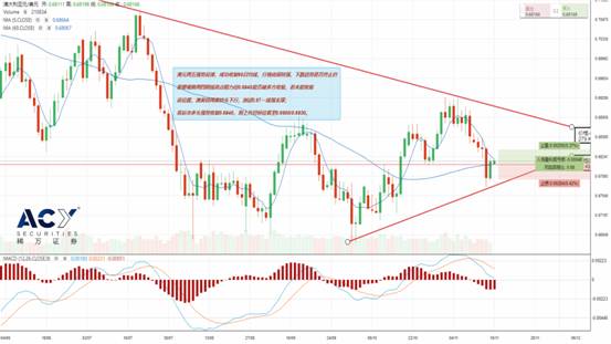 11月18日(周一),贸易局势区域缓和,叠加人民币汇率反弹升值,提振澳元兑美元止跌反弹,上周五收中阳线,成功收复60日均线,暂报于0.6821。今早亚盘时段澳美低开整理,跌0.13%,暂报于0.6812。