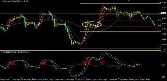 从WTI原油1小时图来看,原油现在还是调整下跌走势,前方的密集区和黄金分割0.5重合,这里未来将是大支撑,所以后市要注意这里,现在继续做空。