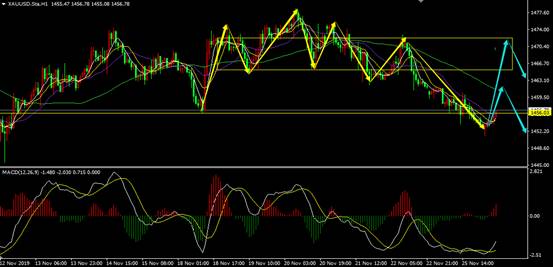 从国际黄金1小时图来看,黄金昨天美盘在前方急拉升的那个低点也抵抗了一下,但效果不大,现在的位置已经远离中枢,理论上三卖的概率大大增加,但原油走势有前车之鉴,必须确认三卖点才行,现在短线做多,后市回不回中枢低点之上将很关键。