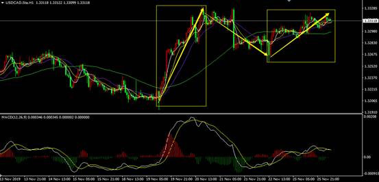 从美元兑加元1小时走势来看,美元兑加元之前预期是四小时级别的ABC调整,现在来看形态已经变异,大五浪之后的另一段拉升明显减弱,虽然也是空头要来的征兆,但和预期已经相差很远。
