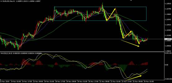 从欧元兑美元1小时走势来看,欧元兑美元已经走完五浪,昨天的新低也是背离,未来大概率是反弹,不过由于前方是平台后下跌,未来反弹ABC要重形态,如果形态走完而幅度没多少,也要出场。