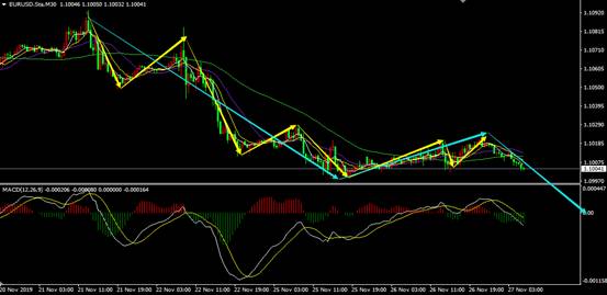 从欧元兑美元30分钟走势来看,欧元兑美元下跌五浪和ABC反弹都有,而且反弹弱势,势必还要造成空头继续发力,后市浪形的级别要升级,也可往四小时上看。