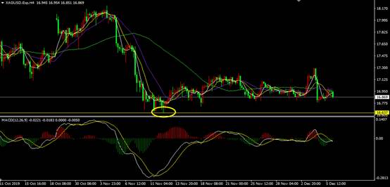从白银4小时图来看,白银接下来一段时间都以16.60为底限,这个位置万不能破,如果下破就要止损出场,只要不下破,无论震荡还是上涨,都持有多即可。
