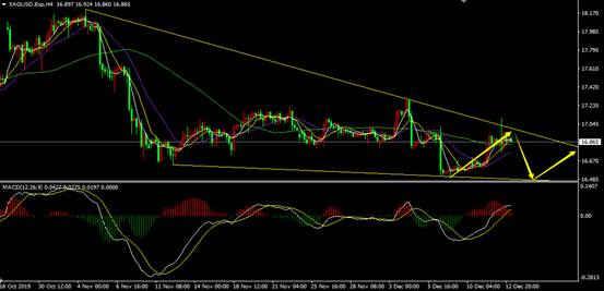 从白银4小时图来看,白银昨天仅是上影线虚破,目前仍是楔形走势,现在位置是压力附近,做的话还是空。