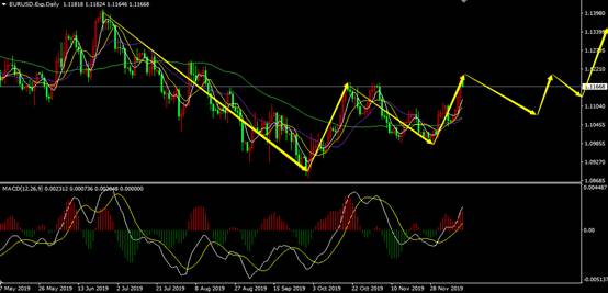 从欧元兑美元日K走势来看,欧元兑美元整体还在前方大跌段的阴影之中,目前不再新低,正是多空转换过程之中,多头逐渐强势,空头却愈发走平,最终实现在转换,所以欧美现在还不是绝对多头,不能去追多,还需要走震荡波段。