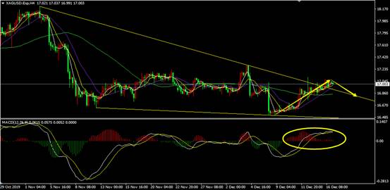 从白银4小时图来看,白银现在站上了楔形压力线,但小级别上多头动能一定是弱的,虽然是上破,但这个多很难做,还是看突破后的调整。