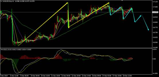 从白银1小时图来看,白银之前上涨中第二段已经很弱势,现在短线上白银空头又在走强,后市大概率要走一个下跌波段。