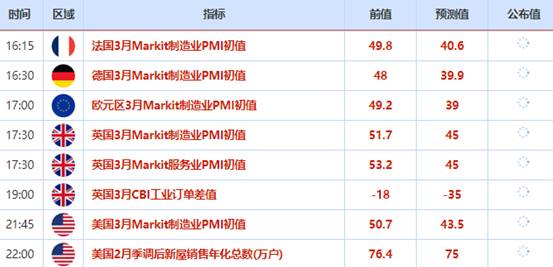 晚间将公布欧美国家的PMI数据,目前市场的预期是欧元区3月Markit制造业PMI初值料跌破40,德国3月Markit制造业PMI初值料录得40,如果符合预期,均为10年来的最低水平。