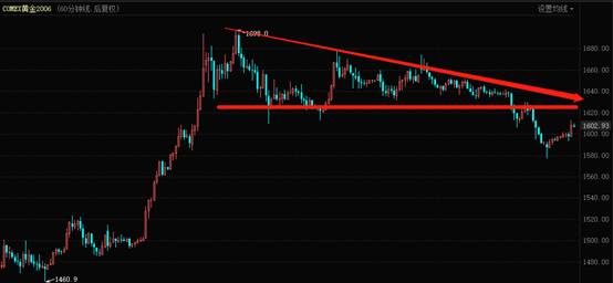 持续的刺激政策缓解了美元的流动性,黄金短线陷入调整。昨日黄金大部分时间继续在1600以上运行,美盘时段一度下破1600至1594区域企稳,最高反抽1613区域,二次遇阻后黄金展开回落,凌晨时段直接破位1600大关,截止当前最低跌至1568区域!昨日日线收盘直接一根大阴线,贯穿1600,从走势上看跌破了收敛三角形的下轨,短期有可能继续向下。