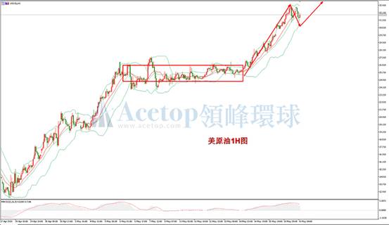 美原油一小时图形上来看,近期呈现多头强势走势,布林带三轨向上发散,油价沿布林带中轨上方运行。需要注意的是,油价在33关口遇阻,出现回落,本次回落第一次击穿了布林带中轨,表明油价有可能进行深一步的调整,寻找布林带下轨的支撑;从四小时周期上看,目前依然在布林带中轨上方运行,MACD指标上未出现背离信号,依然是强势多头状态。建议日内投资者采取做多的思路进行操作,多单入场位置可以参考一小时布林带下轨,该区间有比较强的支撑。