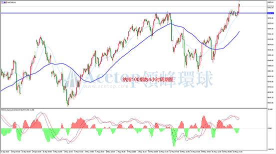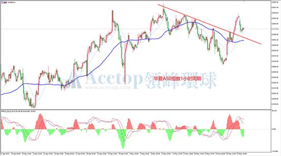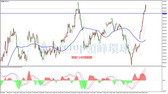 从上图德指一小时周期走势图来看,德指近期走势极强,德指从5月14日开始的低点上涨至今延续了1000余点,直接上涨至前期高点位置附近,实现V型反转。从均线上来看,德指目前MA5、MA20、MA60,短中长三条均线呈现多头排列走势,并且K线站稳均线上方,建议以做多为主。如上图划线为德指前期成交密集区,日内操作上可等待回调此区域做多。