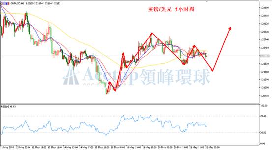 如图所示,在磅美1小时周期中,以邻近的高点1.2295为起始点的1小时下跌趋势已经形成,日内延续此波下跌趋势破掉昨日的低点概率偏大。但受到大周期趋势支撑,磅美还有上涨反弹的空间。故而偏向先下跌后上涨。均线指标目前MA13、MA21与MA72均线都处于粘合状态,对方向判断无参考意义。建议投资者可以关注RSI指标,接近70附近可以尝试做空,接近30附近可以布局多单。