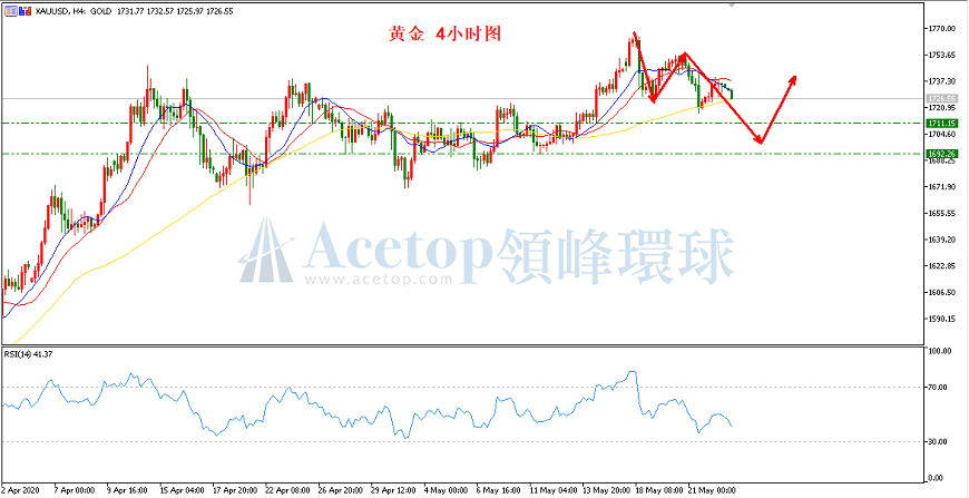 如上图所示,在黄金4小时周期中,趋势上依旧需要关注1715能否跌破,若不跌破黄金短期还能再上涨至1750上方;若跌破,确定黄金短期4小时下跌趋势形成,后续将延续此波下跌趋势。在亚欧盘时段,可关注1723能否跌破,跌破1723下跌至1715的可能性相对较大。指标上MA13均线、MA21均线与MA72均线都已形成死叉,预示短期偏空的可能性较大。