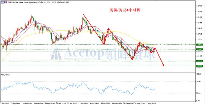 如上图所示,在镑美4小时下跌趋势中,目前此波下跌走势保持完好,意味着后市破前期低点1.2074的概率较大。方向上偏空头。