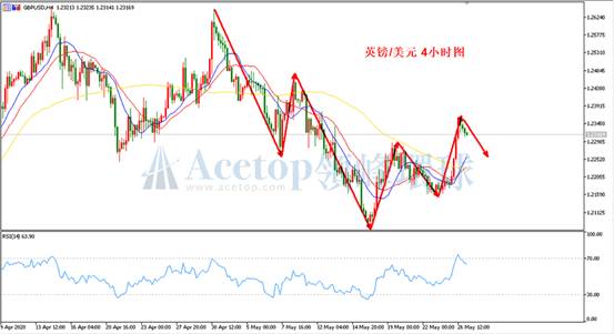 昨日磅美一度冲高至1.2362,受到日线和周线级别均线阻力当前小幅回落。方向上,预期震荡上涨。