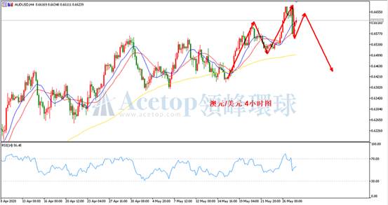 如上图所示,在澳美4小时周期中,以趋势来的角度来判断,短期自低点的上涨趋势还在保持,但在此处位置需要格外留意,因为当前澳美价格已进入周线级别阻力区了,有如昨日一样,要防止澳美价格突然的大跌。指标上,MA13均线和MA21均线朝MA72均线收敛,从均线上看,日内可能围绕三线来回震荡。RSI指标的波动基本随价格的上涨而上涨,随价格的下跌而下跌,在进入超卖或超买时也表现为相应的回撤,这对于当前行情来说,非常具有参考意义。建议投资者关注RSI指标值,当RSI位于70附近时考虑做空,位于30附近时考虑做多。