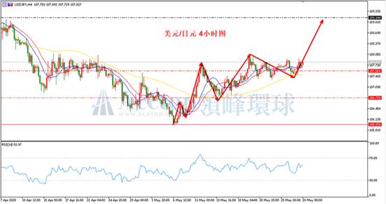 如上图所示,在4小时周期中,美日的上涨趋势保持完好,若后续以5月6日低点105.97为启动点的上涨趋势保持不变,未来上涨可看至109.14、109.93甚至110.72附近。指标上,4小时周期的MA13均线、MA21均线与MA72均线一直保持多头排列状态,在趋势形成的情况下,跟踪均线指标是一个省力省心的好办法。建议投资者以MA72均线作为方向参考,不破方向看涨,回踩至MA13和MA21均线即可尝试做多。