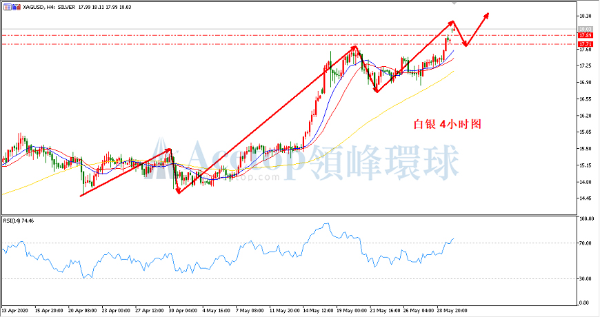 如上图所示,在白银4小时周期中,以4月21日的低点14.53为起始点的上涨趋势保持依然保持完好,目前存在2次有效回调,从此波上涨趋势来看,暂时还未有结束的迹象。整体方向依旧偏涨,回调做多将是主思路。指标上,MA13均线、MA21均线和MA72均线保持同向,呈现多头排列,预示后市将进一步上涨。RSI指标当前位于70之上,亚欧盘时段谨防回调。