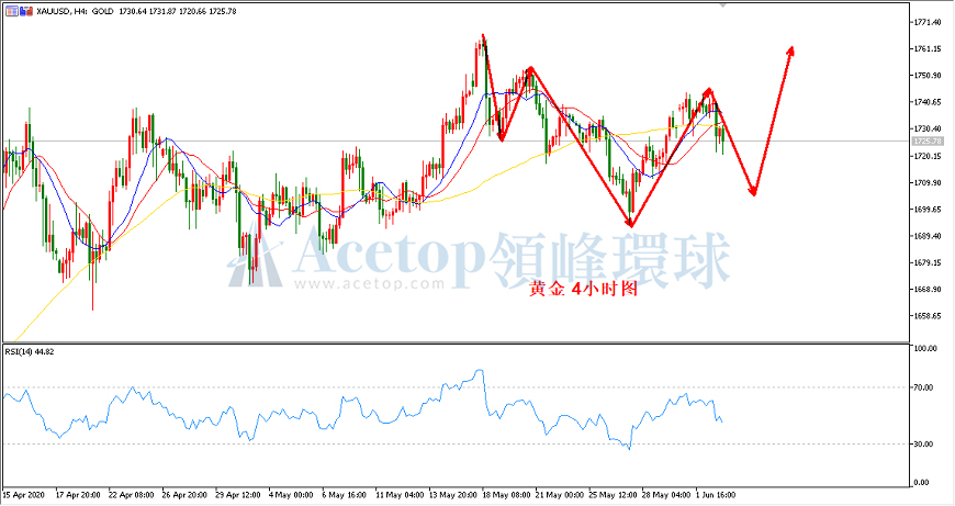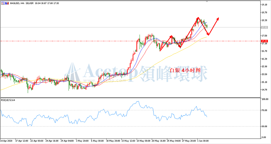 今天市场将公布美国一系列重要经济数据,包括工厂订单、ISM非制造业PMI、耐用品订单等数据。与此同时,加拿大央行将会公布利率决议,市场普遍预计该央行将维持当前利率不变至少到2021年底。其中重点需要关注晚间20:15分公布美国5月ADP就业人数,前值为-2023.6,预期值-900,若实际公布值好于预期,则说明美国经济在5月份逐渐恢复,利好美元利空金银。从这两个月美国采取的各种恢复经济举措判断,预期是利好美元的,金银本轮的上涨也应该要有所回落了。