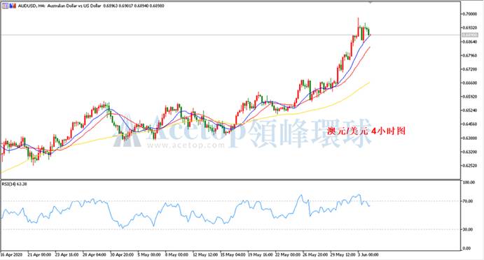 如上图4小时所示,趋势上,日内重点关注0.6817能否跌破,若跌破日内偏向下跌。反之,在没有跌破之前,澳美还能继续创新高。由于澳美日线周期中单边上涨近半个月时间,且当前RSI已经处于超买状态,若今日跌破0.6817,后续务必防止有大的调整。4小时指标上,RSI二次背离又存在4小时顶分型,建议可以尝试以前高为止损布局空单。