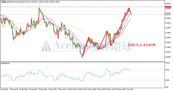 如上图所示,在镑美4小时周期中,邻近的上涨趋势并未改变,整体方向依旧偏向多头。但日内有望在1.2620的阻力下,进一步下跌测试MA21均线和MA72均线的支撑,就日内短期而言,偏向下跌回调。指标上,当前价格已跌破MA13均线的支撑,预期会继续试探MA21均线支撑。观察RSI指标的变化,不难发现已经出现了顶背离的现象。在目前4小时周期中已出现背离、顶分型又受到日线阻力压制的情况下,谨防市场的深度调整。