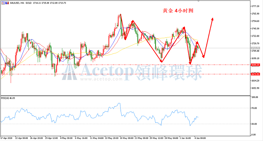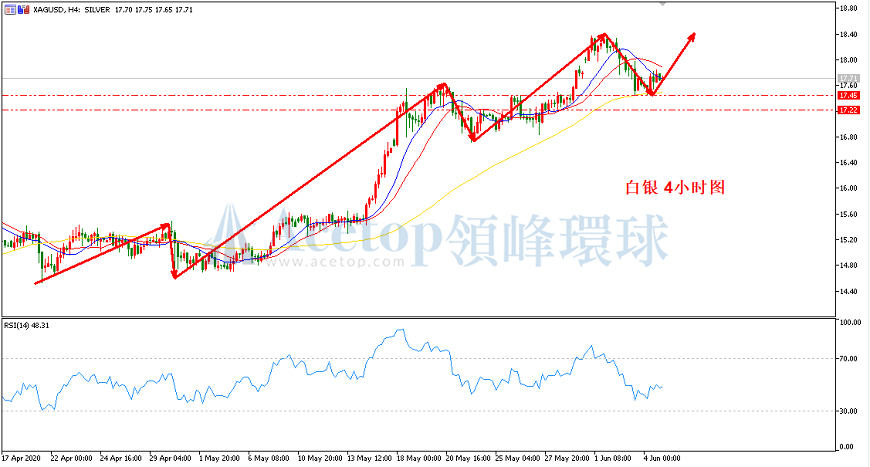 今日晚间20:30分美国劳工部将公布美国5月非农就业数据。就业人数在4月录得史无前例的下降2050万人后,预计在5月将录得下降800万人。尽管非农就业人数下降幅度大幅的缩减,但是预计失业率将从14.7%进一步升至19.5%,这是自大萧条以来的最高水平。若公布的数据大于预期的19.5%,则利空美元,将进一步支撑黄金上涨。相反,在经济解封期间,就业人数若得到有效得回升,美国经济逐步回暖,则利好美元,将进一步抑制金银的上涨。