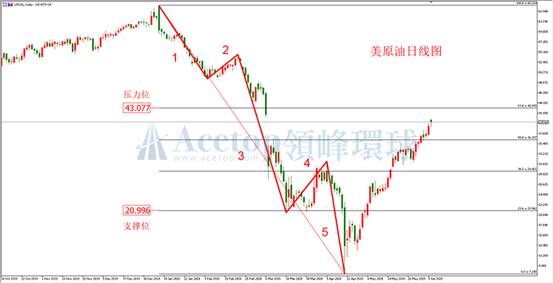 如图所示,美原油日线级别自高点65.20美元附近下跌至年内低位,完美构建着下跌五浪走势。其中,第五浪下跌虽然创出新低,但并未有效下破关键区间13.68—16.30,因而带来整体下跌走势的诱空行情。因此可以确定诱空之后,美原油反弹的上方强压力为43.00美元附近。此外,在美原油四小时级别,油价创新高之后的关键区间为39.10—39.60附近,该区间已在早间亚盘初步测试且支撑有效。加之OPEC+延长减产协议的利多影响,短期油价依旧可看上涨为主。