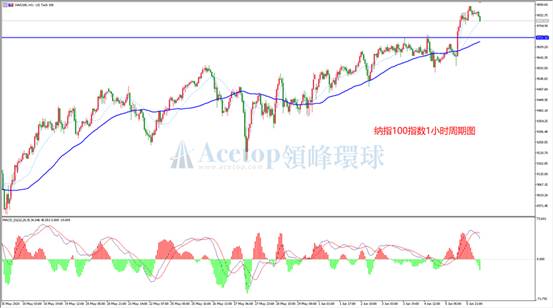 从上图纳指1小时周期图来看,纳指上周五再度加速上涨,再创历史新高,上涨动能极其强势。技术上,上周五MACD指标伴随K线同步创出新高,指标无背离信号,上涨趋势有望进一步延续。不过,MACD目前出现死叉,短线有调整迹象,建议等待回调做多。如图蓝色水平线为前期高点成交密集区的平台,具备较强支撑,日内如回调到此位置附近可轻仓尝试做多。
