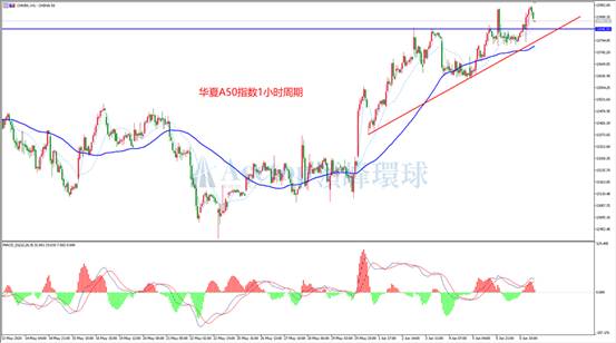 从上图华夏A50指数一小时周期图来看,华夏A50指数仍然正处于震荡上行的走势中。昨天冲高回落后,今天再度冲高回落,整体波动高低点在抬升,成交密集区也在上移。技术上,连接近期的几个重要低点可形成如图的1小时上升趋势线,目前仍然支撑A50的走势。同时,MACD指标目前在零轴上方,多头动能清晰,故建议耐心等待回调支撑线做多为主。