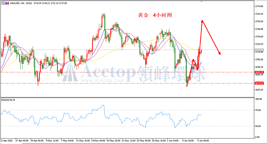 如上图所示,在黄金4小时周期中,自当前高点的下跌趋势是形成的,本周反弹将面临1736的阻力,若1736能被突破,金价将会进一步突破至1745-1755一带,否则,金价还将回到1700下方。指标上,均线呈现出相互交织状态,这告知投资者短期内金价还将持续震荡,只是日内短期偏向延续昨日上涨。RSI当前位于60附近,投资者可以关注其是否会出现超买现象,若能到70上方,可结合上方1736附近的阻力考虑空单。