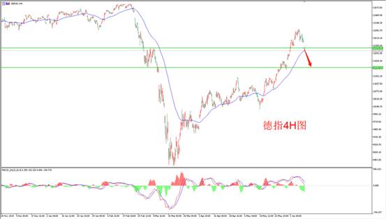 德指昨日开盘后震荡回落,欧盘小幅震荡,整体为调整走势,今日开盘后,跳空低开,走势较弱。从4小时图上看,德指价格走势图上60周期的EMA均线有较好的趋势效果,目前走的强势上行的行情。上方的压力在12270附近,下方的支撑位在11600附近,MACD指标上,双线在0轴上方附近,能量柱在放量,显示价格的强势信号。故在策略上,暂时建议投资者在德指支撑位做多。