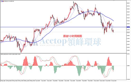 美原油1小时周期上,上周五冲高回落,宽幅震荡。从图中可见,上周五反弹最高点低于前期下跌低点,反弹力度较弱。今天开盘低开低走,下跌动能较强。结合MACD指标来看,DIFF线与DEA线上周在反弹接近零轴后,今天再度死叉向下,下跌趋势延续,建议继续看空。操作上,重点关注上周五震荡的中轴位置,此位置压力位较大,反弹可尝试做空。