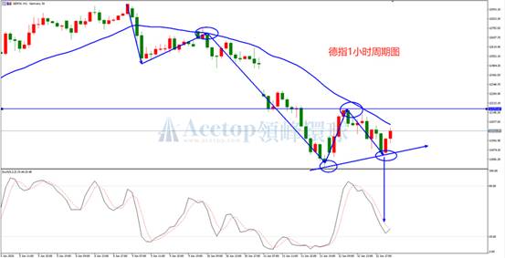 德指1小时图来看,德指在创出年内新高12900后立马跌入多空线下方区域。并且德指在多次反弹触碰多空线后都拐头向下。而在今天的走势来看,虽然仍处于多空线下方,但下行结构已经被改变。低点并没有顺着趋势创出新低,反而结合着Stoch指标有反弹的迹象。预计在小时级别有反转的可能性,可以尝试做向上突破型的进场。