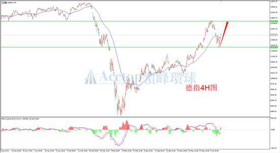 德指昨日开盘后震荡,欧盘小幅反弹,整体为调整走势,今日开盘后,跳空高开,走势较强。从4小时图上看,德指价格走势图上60周期的EMA均线有较好的趋势效果,目前走的强势上行的行情。上方的压力在12900附近,下方的支撑位在11600附近,MACD指标上,双线在0轴下方附近,能量柱在放量,显示价格的强势信号。故在策略上,暂时建议投资者在德指支撑位做多。