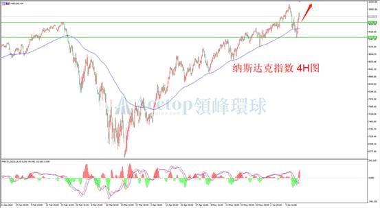 纳斯达克指数昨日大幅反弹,将走小周期的调整。从纳斯达克指数4小时周期图来看,下方的9380支撑较为明显,进行反弹调整,目前收出阴阳K线,将走调整行情。下方的MACD指标双线在0轴下方形成金叉,能量柱逐渐放量,显示出调整的信号。因此目前来看,纳斯达克指数的走势为高位调整,具体策略上,则可以在支撑附近轻仓尝试多单。