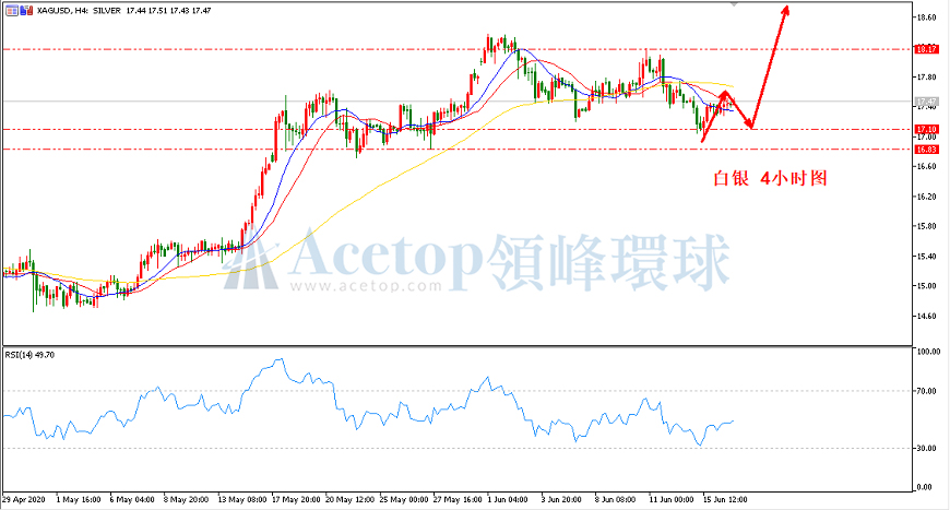 回顾昨日白银价格走势,最高录得17.56,最低录得17.27,日线收十字星。方向上,震荡上涨概率较大。