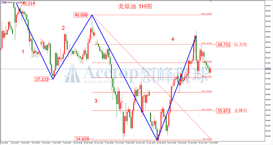 如图所示,美原油从近期高点40.50美元开启下跌趋势,其中40.00美元至36.66美元可标记为第三浪下跌,当价格二次测试34.66美元企稳后,第三浪下跌结束,第四浪反弹开启。按照美原油价格走势,第四浪在昨日触及38.73美元(黄金分割线0.764)重要压力位承压回落,反弹行情也宣告结束,第五浪下跌正在构建。而出于保守起见,交易者先关注第五浪下跌的一个重要支撑位35.80美元附近。